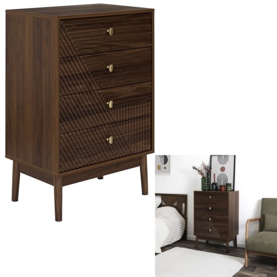 Komoda wymaga montażu Materiał: Płyta MDFw okleinie imitującej orzech. Nogi drewno sosnowe, uchwyty metal. Komoda wyposażona w 2 fronty za którymi kryją się dodatkowe półki. Max. obciążenie mebla 40kg.