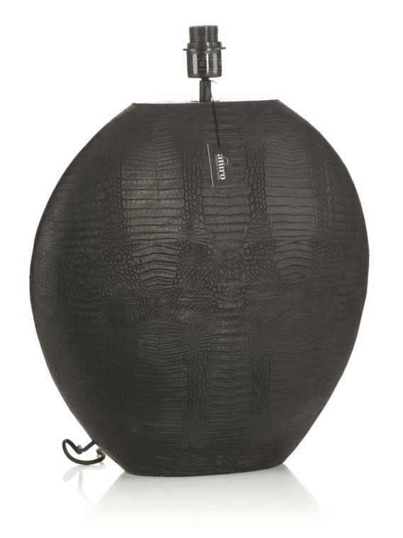 Wykonana z mas żywicznych w owalnym kształcie, w czarno-matowym kolorze ze wzorem imitującym skórę węża. Lampa postawiona na konsoli, komodzie lub stoliku pomocniczym, wzbogaci aranżację stylowego salonu, sypialni a także gabinetu.