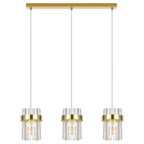 Złota lampa wisząca z kolekcji Vetro to połączenie elegancji i prostoty w nowoczesnym wydaniu. Podsufitka została wykonana z metalu w kolorze złota, a klosze z transparentnego szkła. Transparentne elementy efektownie rozpraszają światło, tworząc przyjemną atmosferę we wnętrzu. Model przeznaczony jest do żarówek z gwintem E14. Lampa doskonale sprawdzi się nad stołem, wyspą kuchenną lub w innych strefach, gdzie liczy się zarówno funkcjonalność, jak i estetyka.