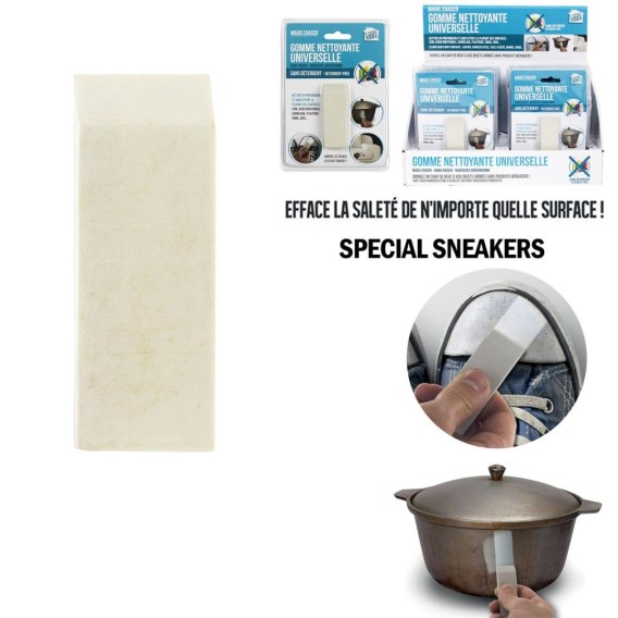 Magiczna gumka to specyfik, który pomoże bez zbędnych detergentów wyczyścić trudne plamy i zarysowania. Jest ona idealna do zmywania osadów, zabrudzeń z długopisu lub kurzu. Różne ślady na ścianach lub innych przedmiotach nie oprą się długo tej uniwersalnej gumce do czyszczenia! Bez użycia detergentów, czyści dokładnie i bez wysiłku większość powierzchni: skórę, stal nierdzewną, płytki, plastik, drewno...