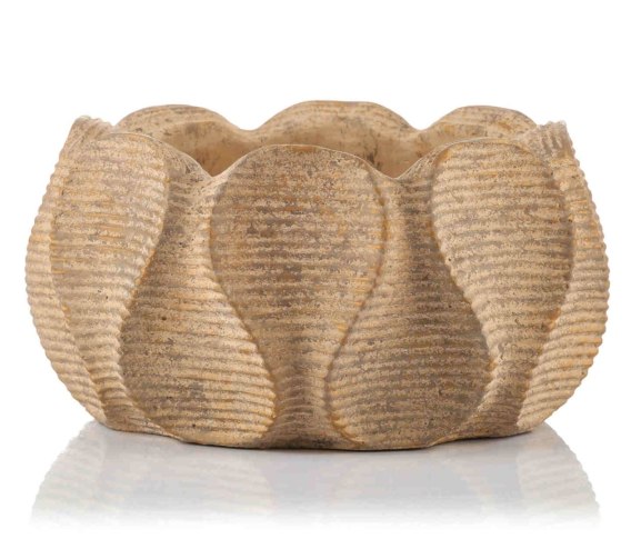 Osłona donicy (misa) WAXY, marki PTMD wykonana z cementu w ciepłym brązowym kolorze, wykończona żebrowanym wzorem. Zaprojektowana w niespotykanej formie połączonych płatków kwiatowych, sprawia że jest wyjątkowym przedmiotem. Postawiona we wnętrzach w formie dekoracji lub z zielonymi roślinami ,będzie przyciągać wzrok dając ponadczasowy element wystroju wnętrz.