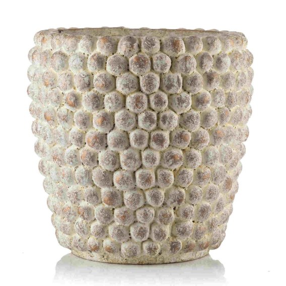 Osłona donicy RUIS-XXL, marki PTMD wykonana z cementu w ciepłym kremowym kolorze z ciemniejszymi przecierkami. Zaprojektowana z kulistym wypukłym (małe kulki) reliefem, sprawia że jest wyjątkowym przedmiotem. Postawiona we wnętrzach z zielonymi roślinami ,będzie przyciągać wzrok i zachwycać przez wiele lat. Osłonabez otworów w dnie.