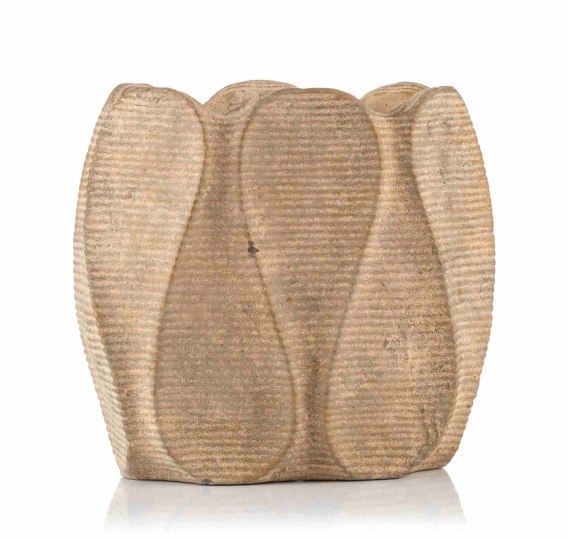 Osłona donicy (owalna) WAXY, marki PTMD wykonana z cementu w ciepłym brązowym kolorze, wykończona żebrowanym wzorem. Zaprojektowana w niespotykanej formie połączonych płatków kwiatowych, sprawia że jest wyjątkowym przedmiotem. Postawiona we wnętrzach w formie dekoracji lub z zielonymi roślinami ,będzie przyciągać wzrok dając ponadczasowy element wystroju wnętrz.