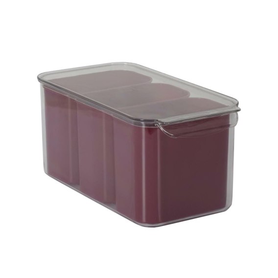 Pojemnik do organizacji owoców, warzyw lub innych produktów w lodówce.Pojemnik wyposażony w 3 przegródi oraz transparentną pokrywę. Wykonany polipropyleniu. Można myć w zmywarce