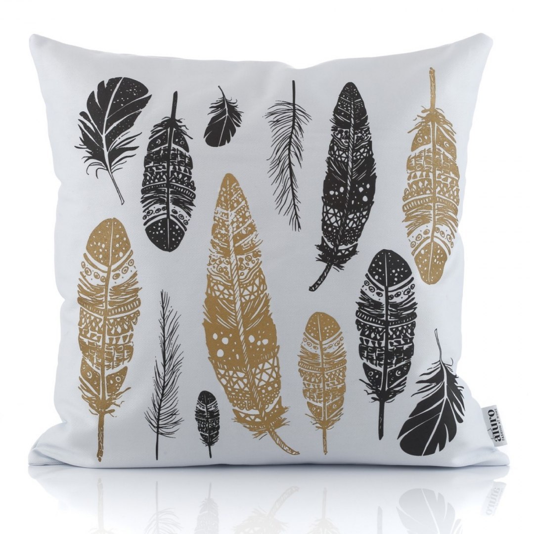 Poszewka dekoracyjna z nadrukiem czarnych i złotych piór, będzie doskonałym uzupełnieniem stylu boho, rustykalnym czy stylu eklektycznego. Poduszka dekoracyjna doskonale sprawdzi się na kanapie lub na patio czy tarasie ozdabiając meble ogrodowe i umilając wypoczynek.