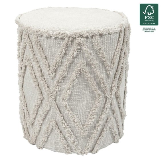 Pufa Mirage to wyjątkowy mebel w stylu boho. Walcowaty kształt pufy dopełnia ciekawa, grubo pleciona tkanina. Pufa ozdobiona została wzorem rombów, które wyłaniają się dzięki dłuższej nitcew tkaniny. Pufa to połączenie wytrzymałej konstrukcji z MDF, obitej miękką pianką tapicerską oraz wykończnej tkaniną 100% poliester. Max obciązenie mebla 110kg.