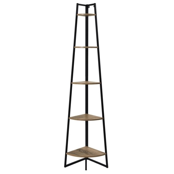 Regał Corner to narożny regał z zaokraglonymi półkami. Regał wyposażony w 5 półek sprawdzi się w przestrzeni w której ważne jest wykorzystanie najmniejszej wnęki. Półki regału wykonane zostały z płyty meblowe w okleinie imitującej drewno. Podstawa regału to metal malowany proszkowo na czarno. Wymaga montażu Max. obciążenie na półkę 5kg