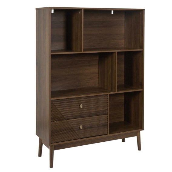 Regał wymaga montażu Materiał: Płyta MDFw okleinie imitującej orzech. Nogi drewno sosnowe, uchwyty metal. Komoda wyposażona w 2 szuflady na metalowyc kulkowych prowadnicach. Asymetryczne półki dodadza meblowi nowoczesnego wyglądu Max. obciążenie mebla 50kg.