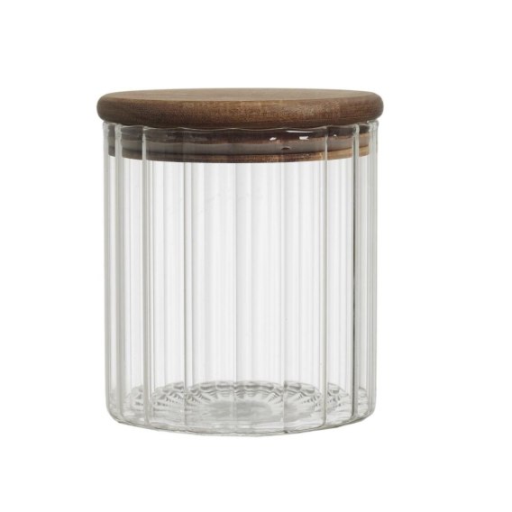 Słój do przechowywania wykonany został ze szkła o ciekawym ryflowanym kształcie. Słój wykończony został drewnianą pokrywką z drewna akacjowego. Silikonowa uszczelka, która została zamontowana na pokrywce gwarantuje szczelność i mocne zamknięcie słoja. Nie mozna myć w zmywarce, Nie można używać w piekarniku, Nie można używać w mikrofalówce. Nadaje si do kontaktu z żywnością