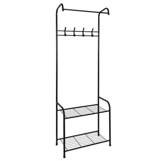 Wieszak do przedpokoju z metalu w kolorze czarnym pozwoli na szybką aranżację przedpokoju. Wieszak 2 w 1, gdyż posiada on wieszaki na kurtki oraz półki na buty. Dzięki temu meblowi możemy uporządkować buty oraz kurtki bez ingerencji w ściany mieszkania. Dzięki temu, że wieszaka nie trzeba mocować do ściany tak jak standardowe wieszaki, nadaje się on idealnie do mieszkania wynajmowanego. Ta niezwykle praktyczna szafa do przedpokoju ma 2 półki na buty i 4 haczyki na kurtki i płaszcze! - Skład: stal nierdzewna, tworzywo sztuczne. Wymiary opakowania: 64,00 x 7,50 x 36,50 cm