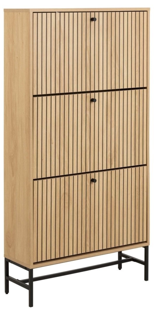 Szafka na buty o wyglądzie naturalnego dębu z lamelowym frontem doda stylu i praktyczności do przedpokoju. Kontrastowy wygląd dębu uzupełniony czarnymi akcentami tworzy dobrze wyważony efekt wizualny. Postaw szafkę w przedpokoju, aby wykorzystać przestrzeń i przechowywać buty poza zasięgiem wzroku. Szafka na buty z frontem lamelowym .. Łatwa w pielęgnacji powierzchnia o wyglądzie dębu . Certyfikat FSC . Zaprojektowany przez projektanta Lasse Cha Pedersena i chroniony wyłącznie dla Actona Wysokośc nóg: 18cm Max. długość buta 35cm Wymaga montażu Wymiary kartonów: 81x69x11cm waga 17kg, 151x59x151, waga 16,7 kg