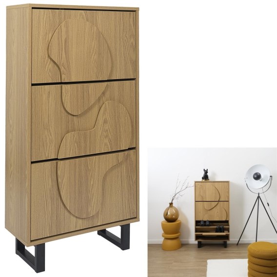 Szafka na buty 3 frontami Calypso to połączenie designy i jakości. Szafka wykonana została z płyty MDF w okleinie imitującej dąb. Front szafki uchylają sie aby móc łatwo włożyć i wyjąć umiszczone w niej buty. Trzy fronty szafk kryją za sobą miejsce na około 12 par butów typu trampki. Umieszczenie wyższych lub szerszych butów może zmniejszyć liczbę par, które będziemy mogli do niej schować. Uchwyty szafek to wypukły nieregularny kształt, który nawiązuje do stylu japandi. Podstawą szafki są nogi w kształcie płozy. Nogi wykonane zostały z metalu malowanego proszkowo. Szafka wymaga montażu. Max. obciążenie na 1 szufladę 6kg. Max. obciążenie na szafkę (szuflady+ górny blat) 30kg. Waga szafki 25kg. Wymiary kartonu: 37,5x15x119cm