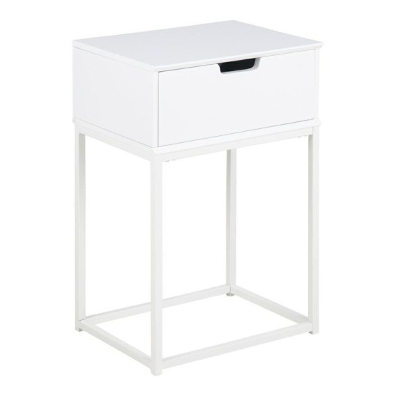 Szafka nocna Mitra utrzymana w stylu skandynawskim wykonana została z płyty MDF w kolorze białym. Podstawę stanowią nogi wykonane z metalu polakierowanego na buiało.. Całość prezentuje się wyjątkowo subtelnie i nowocześnie. Szafka wyposażona jest w jedną bardzo pojemną szufladę.