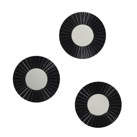 Zestaw 3 luster o średnicy 19cm t idealna ozdoba ściany salonu, sypialni lub przedpokoju. Lustra o ciekawym, harmonijkowym kształcie dodają głębi pomieszczeniu. zestaw 3 luster idealnie będzie komponowac się z kwiatami oraz zegarem w stylu japandi. Zwierciadło luster wykonane ze szkła, natomiast rama to tworzywo sztuczne. Średnica zwierciadła to 10cm.